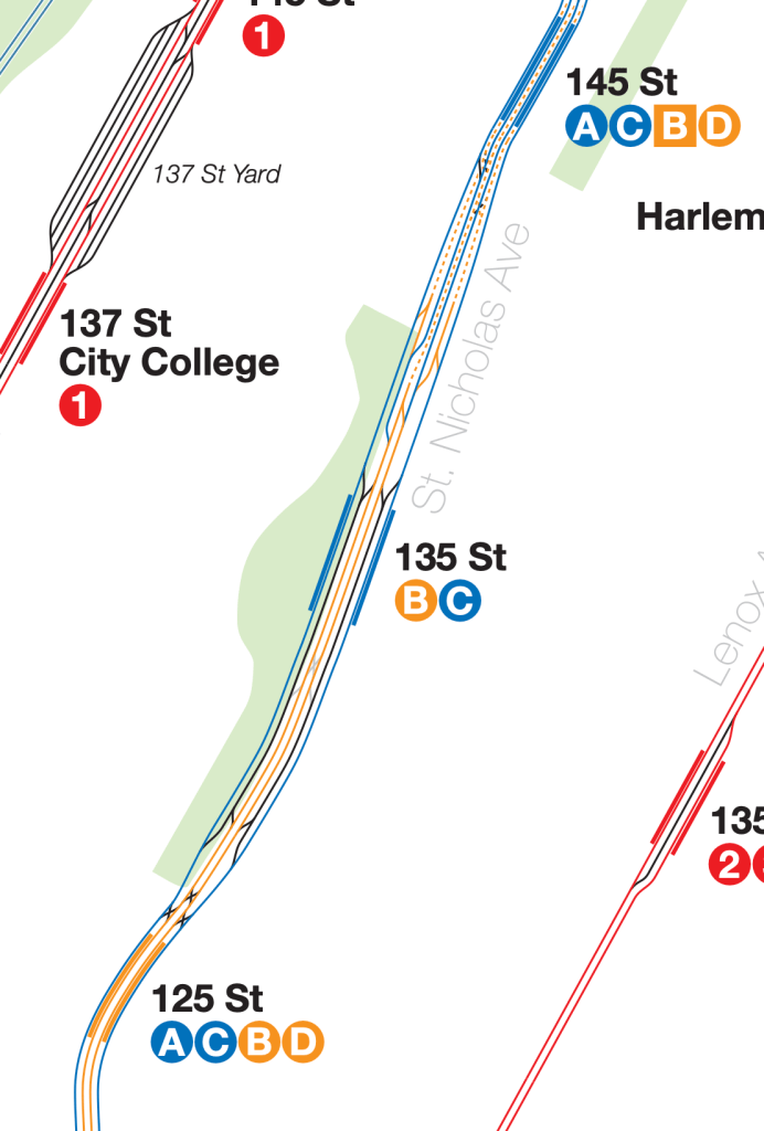 - With the C train, lets change how the A train runs. First, it will now run express in Brooklyn. Fulton is a long line that deserves express service, especially for the Rockaway residents who are about to lose subway service for months. In Manhattan it will run normally, and at W 4 st, it will follow the E train to 8th Ave. From there, however, the A train will end at 34 st – Penn Station. For some god forsaken reason, there are like no switches on 8th Ave, which makes running alternate service here pretty bad. The only place between W 4 st and 59 st that a train could be turned around is the express tracks at 34 st Penn station, there’s nothing for the local tracks. I really think the MTA should build a set of switches to allow trains to turn around on the central tracks of 42 st – PABT, as this is a great ending spot for trains on a lot of service patterns, and would be a boom to 8th Ave service for weekends like this weekend.