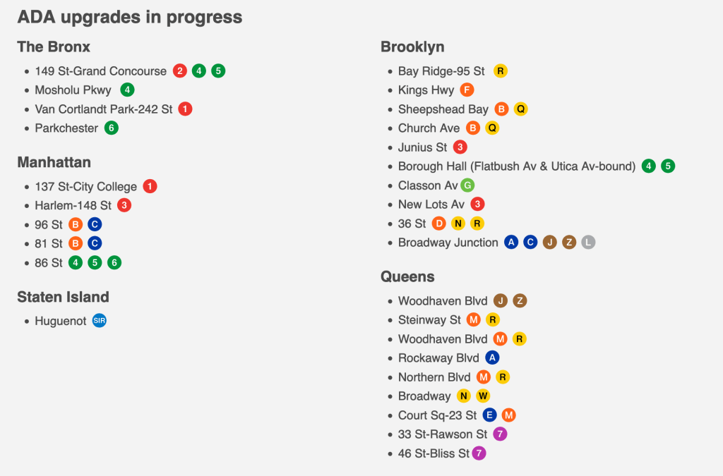 Now that a strategy has been established for making stations, lets look at how the MTA is choosing stations, by looking at the current list of stations to be made accessible, as well as the stations set to be made accessible in the 25-29 Capitol Plan.