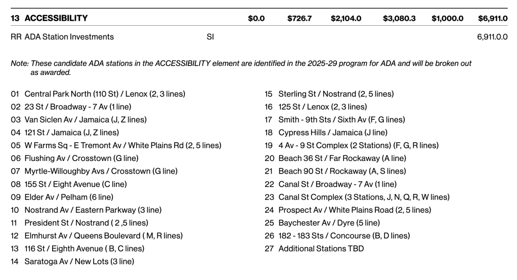 Look, this plan isn’t all bad, there is some good stuff in here (4 Av – 9 St and the Canal St Complex are definitely the headliners) but the lack of will to finish the stations that are already partially accessible baffles me. If I had to make a list of the 26 most deserving stations for accessibility upgrades, it would look very little like this.